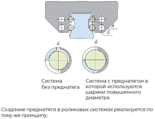 The carriage preload is determined by the rolling element diameter. Using larger diameter rolling elements creates a certain carriage preload. Selecting balls and rollers with a diameter larger than the nominal size determines the preload.